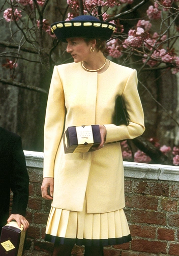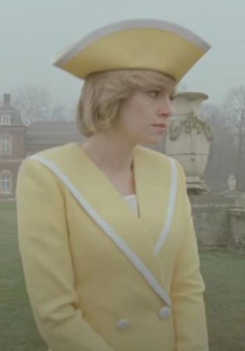 Еще одна вольная интерпретация гардероба Дианы — желтый костюм, в котором мы видим принцессу в саду рядом с поместьем. Однако желтый действительно был одним из самых любимых оттенков Уэльской — похожий образ она примеряла в 1992 году во время пасхальной службы в Виндзоре (читайте также: От Дианы до герцогини Кейт: лучшие пасхальные образы королевских особ).