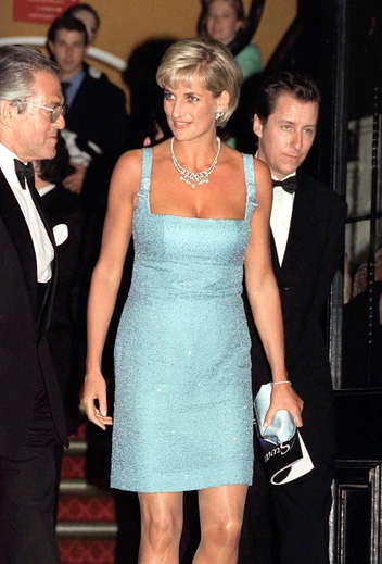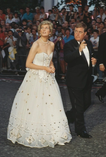 За месяц до свадьбы в июне 1981 года Диана появилась на публике в роскошном красном вечернем платье в горошек на премьере фильма о Джеймсе Бонде «Только для твоих глаз». Она снова надела его три года спустя, когда была беременна принцем Гарри. В сериале «Корона» художники по костюмам создали похожий образ, дополнив его украшениями и копией семейной тиары Спенсер, которую она носила в день своей свадьбы.