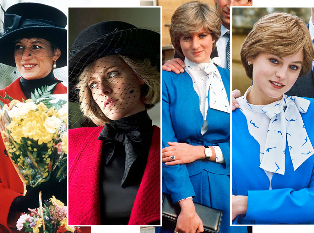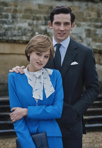 19-летняя принцесса Диана и 32-летний принц Чарльз объявили о своей помолвке после шести месяцев знакомства, 24 февраля 1981 года. В четвертом сезоне сериала «Корона» этот образ воссоздали с детальной точностью, вплоть до копии королевского синего костюма Дианы, который она купила себя в знаменитом лондонском универмаге Harrods.