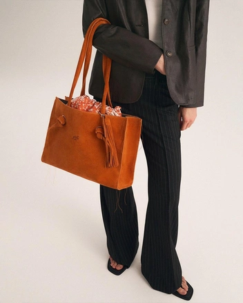 Замшевая сумка Raw Bag в восьми самых осенних оттенках: от темно-синего до оранжевого. Просторная и выразительная модель с регулируемой ручкой на узлах сочетает в себе практичность и стиль, а свободная отделка контрастными нитями придает образу особую динамику и акцент. Бренд рекомендует украшать сумку любимыми подвесками и брелоками, а также играть с разнообразием цветов, раскрывая вашу индивидуальность.