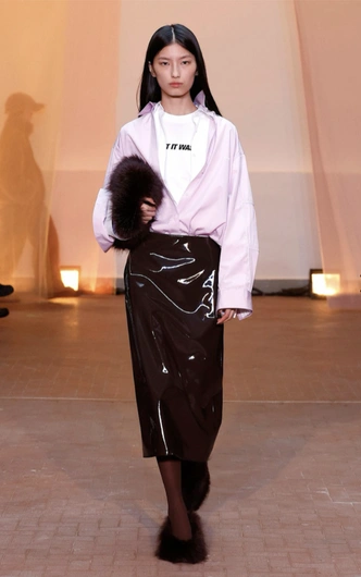 За примером далеко ходить не надо: MSGM сбалансировали темпераментную виниловую юбку хлопковой рубашкой и самой что ни на есть базовой белой футболкой. Мех тут тоже не лишний: особенно, если подобран в тон юбке, а не конкурирует с ней. Он как кайенский перец в салате, можно было обойтись без него, но с ним необычнее вкус.