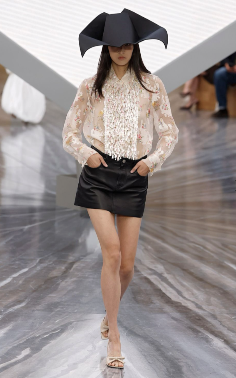 Одной из главных героинь показа Джонатана Андерсона для Dior SS/26 стала мини-юбка. Парадокс, но в стилизации от дизайнера она не выглядит вызывающе. Мечтательная блуза в мелкий цветочек в стиле рококо, застегнутая на все пуговицы, мюли с трогательным бантиком — и образ без намека на откровенность готов.