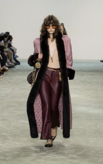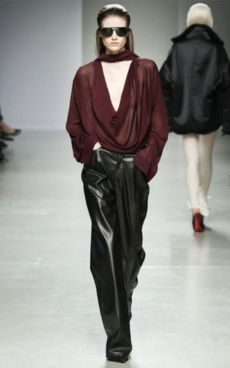 Бохофикация Chloe проходит успешно: джинсы клеш, как главная деталь гардероба богемы, превратилась в кожаные брюки, чтобы можно было дать boho chic даже зимой. Чемена Камали считает, что одних брюк для бохо-образа недостаточно, и комбинирует leather pants с брелоками, богемным пальто с мехом и очками-авиаторами. Такой максимализм, в общем-то, необязателен: и с простым джемпером, и с прямым пальто брюки тоже будут смотреться ярко.