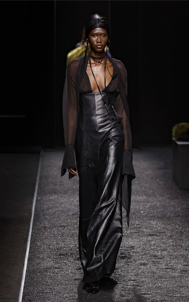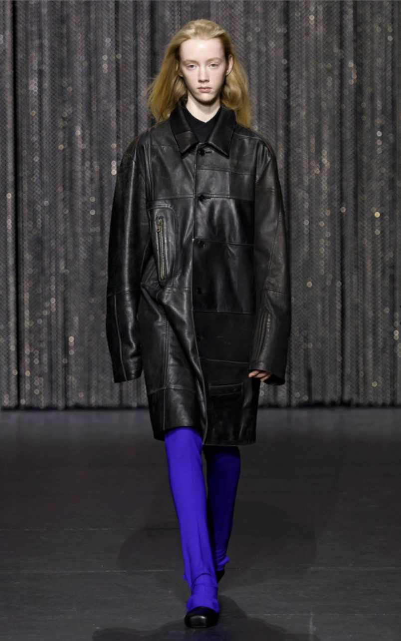За неумолимо длинные кожаные брюки на Неделе моды FW/25 отвечали Atlein. Как такового руководства к применению тут нет, кроме, разве что, банального совета — носить каблук, чтобы чувствовать под ногами что-то, кроме собственных штанин.