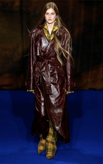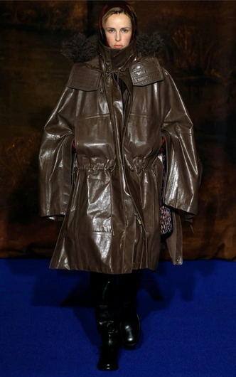Летом 2025-го мы носили куртку рабочего в оксфорде или нейлоне с вельветовым воротом, сейчас видим что-то вроде гибрида кожаного плаща и barn jacket. Но теперь в коже. Grandpa chic можно продолжить, добавив вельветовые брюки, мокасины с драпировкой ткани, как с показа Prada FW/25, и клетчатую рубашку с шоу Burberry. Но это необязательное правило: Simone Rocha в шоу SS/26 совместили простой дождевик с перчатками в пайетках, и выглядело это оригинально и свежо.