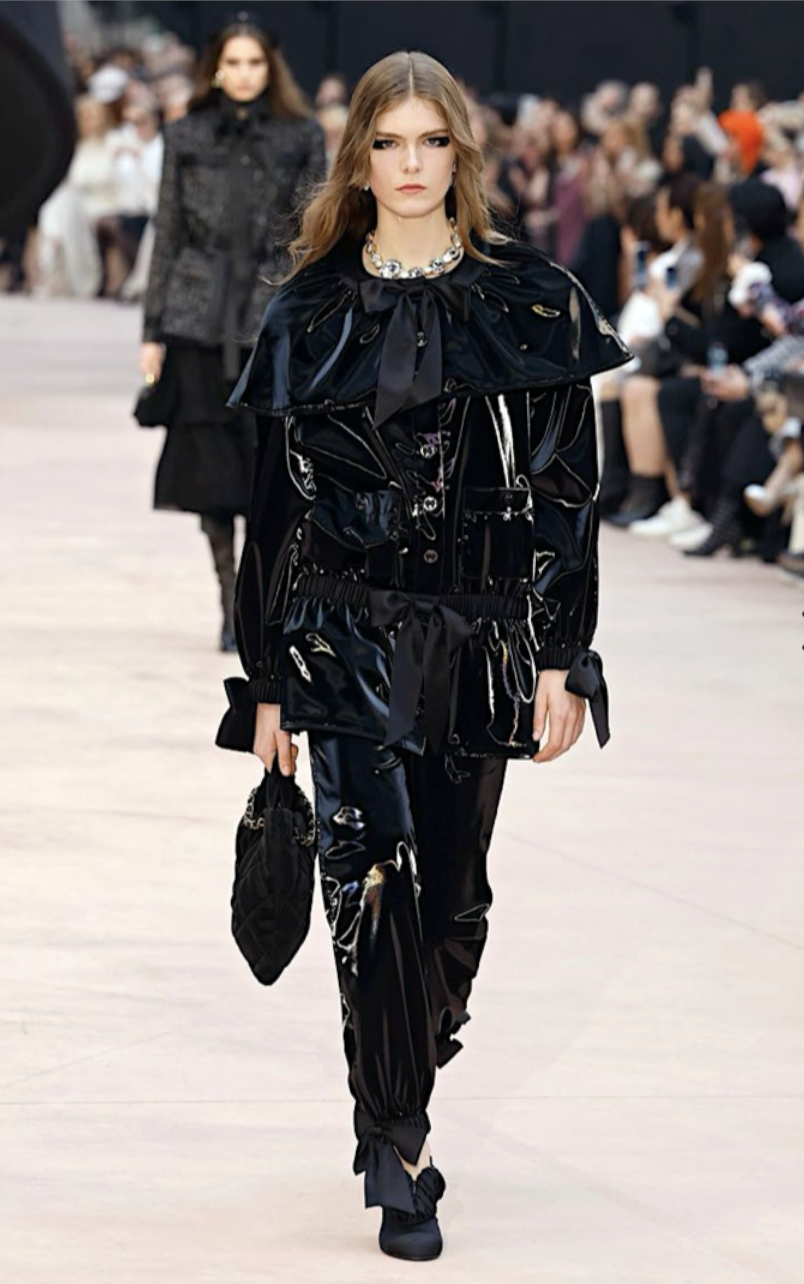 Chanel на показе осень-зима 2025 задали тренд на виниловые брюки. В интерпретации бренда штанины сопровождаются завязками в форме банта — одного из кодов Дома. Но если вы не Chanel Girl, а просто хотите носить виниловую пару, то подойдут и простые прямые брюки без деталей. Для вечернего выхода можно добавить акцентных украшений, чтобы усилить глэм-образ, для повседных луков винил хорошо сочетается с любыми активными принтами — клеткой, горохом, тонкой полоской.