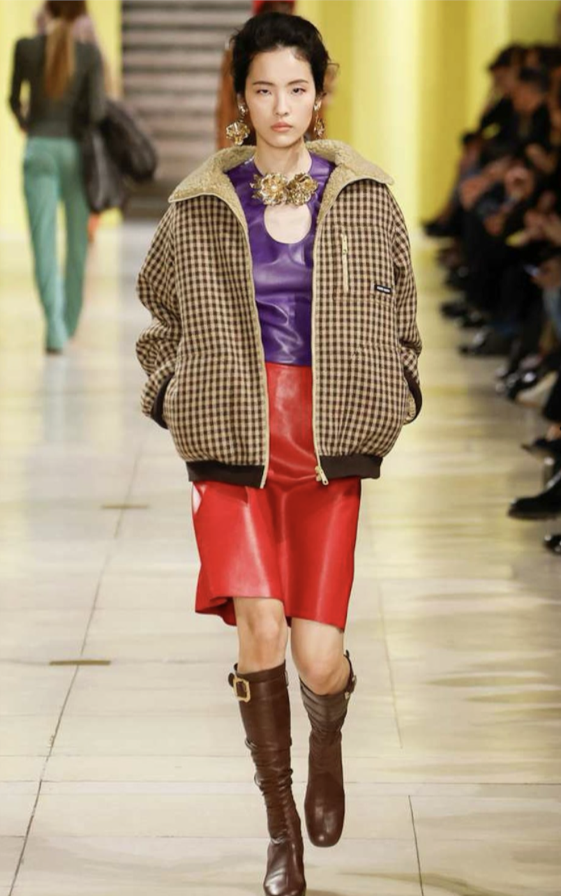 Новую базовую юбку, конечно, из кожи представила и Миучча Прада: на шоу Miu Miu объединила красный низ с баклажановым топом, клетчатым бомбером и коричневыми сапогами-скинни. Микс, на который решиться непросто, но, в конце концов, можно вдохновиться на один цветовой дуэт: красный+коричневый.
