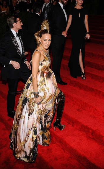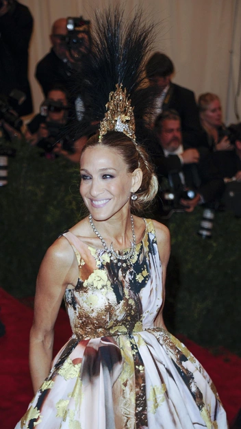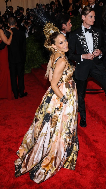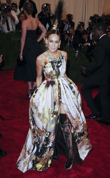 Сара Джессика Паркер ежегодно поражает нас смелыми решениями, которые относятся исключительно к высокой моде. В 2013 году Анна Винтур предложила гостям стиль «панков», звезда «Секса в Большом городе» поняла задачу буквально и вышла на дорожку с эрокезом из перьев. А еще просим обратить внимание, как вельветовые ботфорты в шотландской эстетике актриса сочетает с платьем с золотисто-черным принотом — кажется, мы попали в фэшн-каламбур (читайте также: Тест: угадайте героиню сериала «Секс в большом городе» по ее фразе).