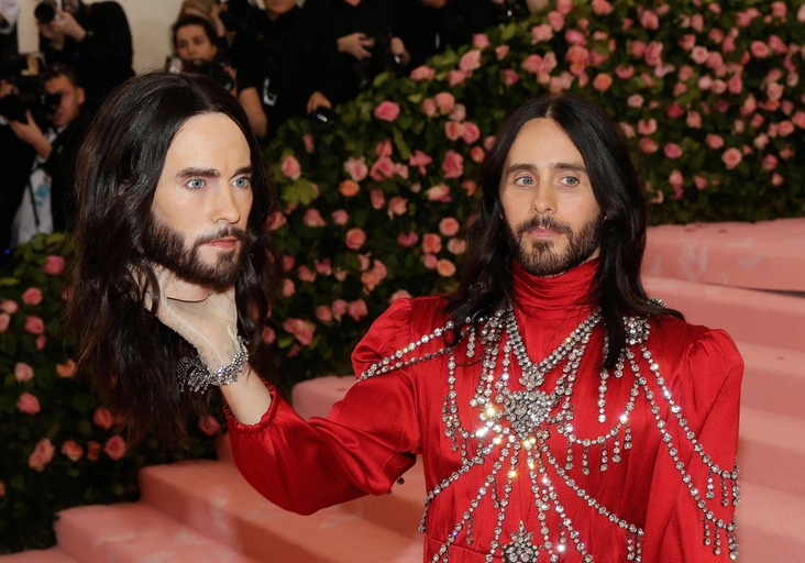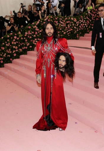 Главная фишка образа Джареда Лета заключается в точной копии головы артиста, выполненной компанией Makinarium. Мало кто знает, но изюминка имела глубокий модный посыл: для бала Лето выбрал бренд Gucci, а игрушечная голова — отсылка к летнему показу бренда 2018 года, когда на подиуме все модели появились со своими же головами в руках.