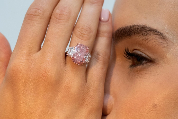 Розовый бриллиант по центру кольца добыли ювелиры бренда De Beers. Он уникален своим размером — цветные бриллианты редко бывают большими, и весом — в 18 карат. По периметру кольца расположены бесцветные бриллианты круглой огранки, а сам металл — платина. Кольцо ушло с аукциона Sotheby's в Гонконге и стало одним из самых больших колец с розовым бриллиантом за 250 лет торгов.
