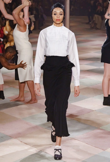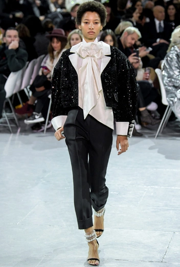 Классический наряд конферансье (который, к слову, совсем не выглядит иронично) ищем у Марии Грации Кьюри в Dior. Вариацию на тему мужского смокинга – у Клэр Уайт Келлер из Givenchy: она вообще любит экспериментировать с лекалами и ставить эксперименты над привычными вещами, создавая что-то совершенно новое и неизбитое.