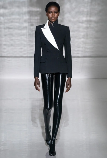 Если явные отсылки к брутальным образам вам не по душе, возьмите на заметку идею Клэр Уайт Келлер: на шоу Givenchy она представила ансамбль из дерзких облегающих брюк из латекса и классического жакета с контрастным лацканом – выглядит крайне свежо и стильно, хоть и выполнено в черной палитре.