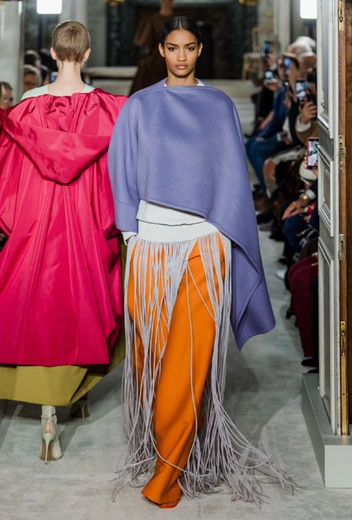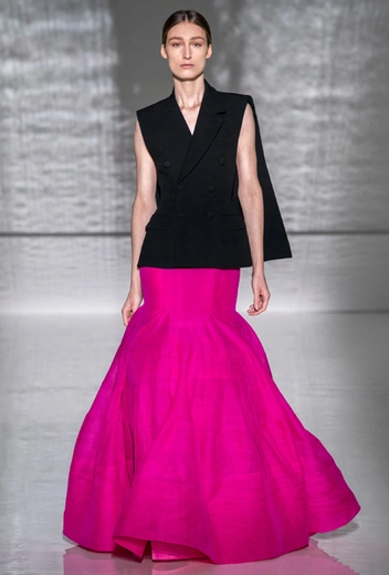 Помним главное: если выбираем яркие, контрастные и неоновые ансамбли, стоит делать акцент только на цвете. Поэтому к сочным краскам – чистые формы и лаконичные фасоны. Идеально минималистичные и четко выверенные ансамбли показывала любимый дизайнер герцогинги Сассексой Клэр Уайт Келли: асимметричные жилеты с один рукавом на манер кейпа в паре с длинной юбкой цвета фуксии – показательный пример, как уравновесить кричащий оттенок.