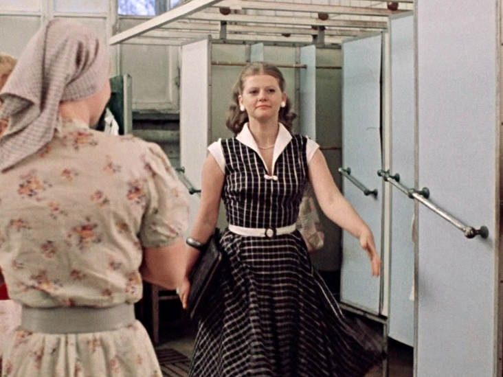 Всеми любимая героиня Ирины Муравьевой была заядлой модницей. Можно сколь угодно гадать, на какие средства простая работница хлебозавода могла позволить себе такие наряды, но сегодня это и не важно. Главное, что они отлично отражали характер своей обладательницы. Особенно нам запомнился первый «выход» Людочки Свиридовой после смены на работе. Черно-белое платье в небольшую клетку с воротничком с первых минут фильма выделило ее среди остальных героинь, задав тон всему ее гардеробу.