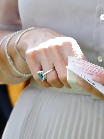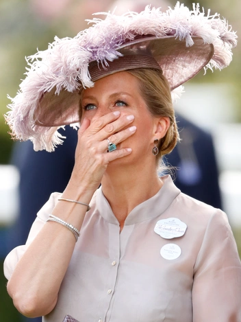 Коктейльное кольцо с крупным аквамарином есть и у графини Уэссекской. На этих снимках она запечатлена в момент, когда Фрэнки Деттори едет на своей лошади Страдивари к победе в «Золотом кубке» в третий день скачек в Аскоте. Эффектное украшение явно добавляет ситуации драматизма.