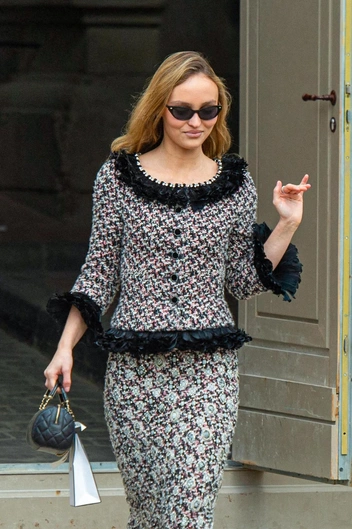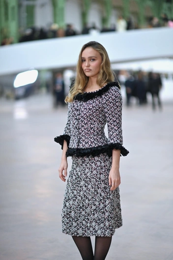 Лили-Роуз Депп, дочь известных актеров Ванессы Паради и Джонни Деппа, появилась на кутюрном показе Chanel в твидовом костюме: юбке-карандаш и приталенном жакете с черными оборками.