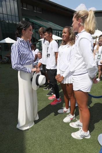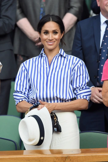 Впервые в роли королевской особы Меган появилась на Уимблдоне в 2018 году. Тогда жена принца Гарри вышла на публику вместе с Кейт — и, конечно, герцогини просто не могли избежать сравнений. Стоит признать, что в этой модной битве победу все же одержала Меган, которая появилась в свободной рубашке в полоску, длинных свободных брюках-палаццо, дополненных плетеной шляпой, очками и миниатюрной сумочкой. Все вещи — от американского бренда Ralph Lauren, который знает толк в безупречных круизных нарядах (читайте также: Новая (старая) Меган Маркл: как изменится стиль герцогини после ухода из БКС).