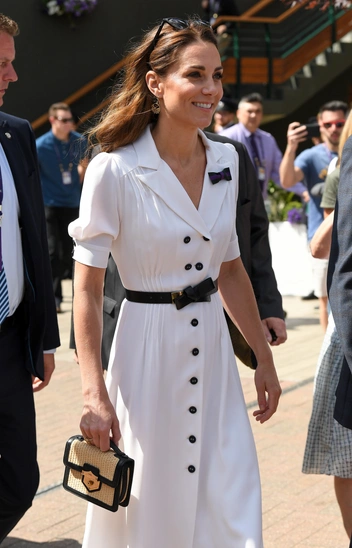 Герцогиня Кембриджская — определенно эталон элегантности и классической женственности. Это она с удовольствием демонстрирует, регулярно появлялась на теннисных матчах. Один из самых удачных образов она показала в 2019 году. Супруга принца выбрала белое платье на пуговицах от одного из любимых брендов Suzannah и дополнила аутфит тонким кожаным ремешком, лодочками в тон и миниатюрной плетеной сумочкой.