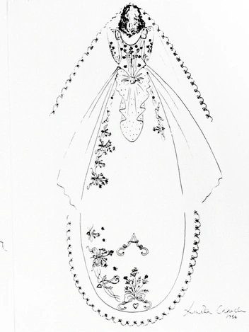 «Линдка была гением; я знала, что она может сшить самое комплиментарное платье на свете, и она сделала это, — писала в своих мемуарах герцогиня Йоркская. — У него была потрясающая конструкция, как у корсета. Мы выбрали атлас дюшес, потому что это самый гладкий материал в мире. Он никогда не мнется. Он ровный, как стекло, и красиво драпируется, без единой выпуклости; благодаря этому моя уменьшившаяся фигура выглядела еще лучше». Венцом наряда стал расшитый бисером корсаж. Рисунок включал сердцы, якоря и волны, олицетворяющие военно-морскую карьеру Эндрю, и инициалы влюбленных.