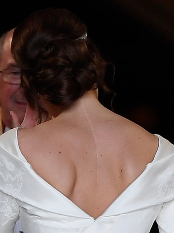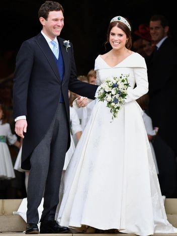 Несколько месяцев спустя в Виндзоре выходила замуж кузина принца Гарри. Для свадьбы со своим возлюбленным Джеком Бруксбэнком принцесса Евгения готовилась с лондонским дуэтом дизайнеров, состоящим из Питера Пилотто и Кристофера Де Воса. Платье с V-образным вырезом, узким лифом и широкой юбкой оказалось крайне комплиментарным, обратив внимание на все достоинства Евгении. Многие отметили, что, в отличие от большинства королевских невест, она отказалась от вуали, однако неизвестно, было ли так задумано изначально: свадьба состоялась в крайне ветренный день, и от аксессуара могли отказаться в последний момент. Впрочем, возможно, что вуаль не подразумевалась изначально, ведь в платье Евгении есть весьма примечательная деталь: треугольный вырез на спине, открывающий шрам принцессы. В 12 лет она перенесла операцию по исправлению сколиоза, и ее желание не прятать шрам было признано самым изящным проявлением бодипозитива.