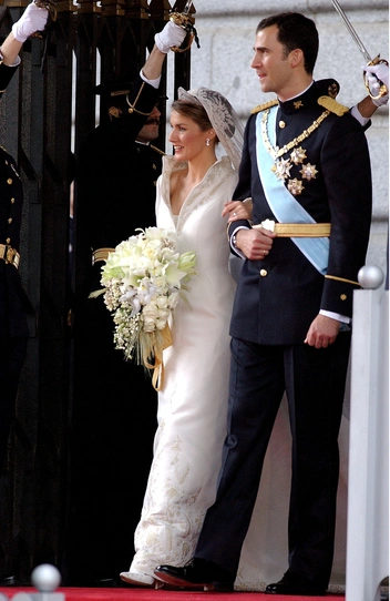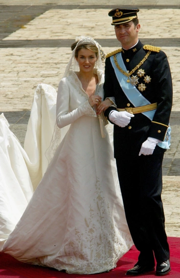 Ровно через неделю состоялась другая королевская свадьба, на этот раз в Испании. Наследный принц Филипп женился на Летиции Ортис — телеведущей и одногодке избранницы кронпринца Фредерика. Испанка также решила показать уважение к своим будущим родственникам и обратилась к любимцу будущей свекрови, королевы Софии. На тот момент кутюрье Мануэлю Пертегазу было уже за 80, но ему удалось добиться изящества и величественности, необходимых для королевской невесты. Выбранный силуэт подчеркнул стройный стан Летиции, зато у платья был длинный шлейф, красиво струящийся по проходу мадридского собора Альмудена. Высокий воротник и длинные рукава, сообразные уровню мероприятия, были украшены вышивкой серебряной нитью в виде геральдической лилии — эмблемы жениха.