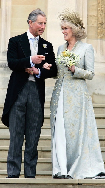 Камилла Паркер-Боулз для свадьбы с принцем Чарльзом в 2005 году решила выбрать альтернативный классическому белому цвет и предстала перед публикой в бледно-голубом ансамбле Robinson Valentine. Образ завершала фантазийная шляпа с крупными перьями и бледно-серые сатиновые лодочки от бренда LK Bennett — фаворита среди членов королевской семьи, в том числе и герцогини Кембриджской.