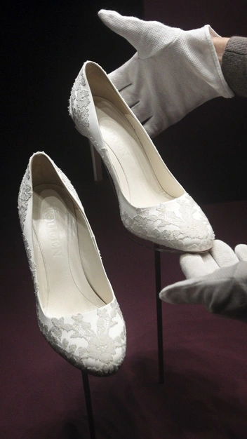 Для создания одного из самых известных королевских образов в истории Кейт Миддлтон выбрала в качестве дизайнера Сару Бертон, креативного директора бренда Alexander McQueen. Она же специально разрабатывала свадебную обувь для будущей принцессы Уэльской — элегантные туфли на среднем каблуке, выполненные из атласной ткани цвета слоновой кости с кружевом ручной работы, которое сотворила Королевской школой рукоделия.