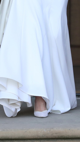 Невеста принца Гарри решила выбрать самый что ни на есть классический вариант обуви для своей свадьбы — любимые ею туфли-лодочки. Честь создать обувь для будущей герцогини также выпала на Клэр Уайт Келлер, которая на тот момент занимала пост креативного директора бренда Givenchy. Модель выполнена с отделкой из шелкового сатина, дублирующего ткань впечатляющего лаконичного платья будущей герцогини (читайте также: Почему свадебное платье Меган Маркл было таким скромным).