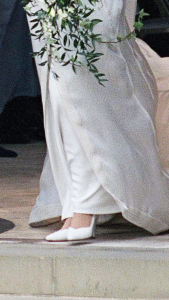 После основного торжества в часовне святого Георгия новобрачных ждала неофициальная часть, где Меган представила свое второе платье от Stella McCartney. К нему герцогиня добавила классические лодочки Aquazzura с бледно-голубой подошвой, выполненные на заказ. Пара идеально перекликалась с другим свадебным подарком ее жениха — аквамариновым кольцом, которое ранее принадлежало принцессе Диане.