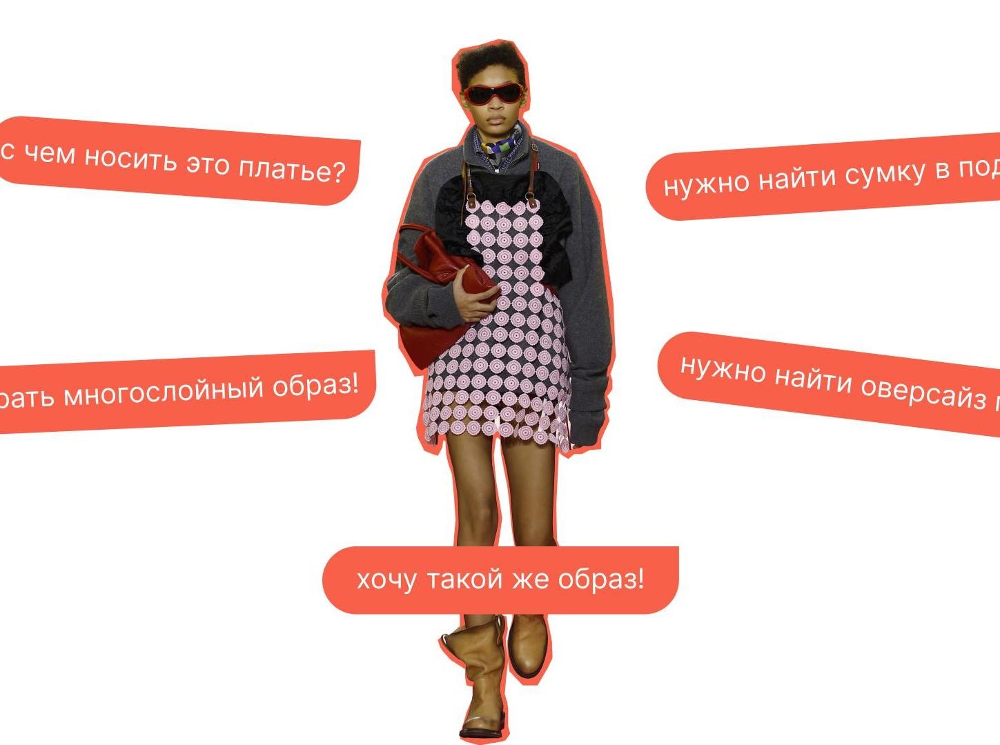 И тут возникает закономерный вопрос: можно ли сегодня повторить тренды с недели моды и найти похожие вещи уже сейчас — в онлайне? Можно — на Яндекс Маркете, где недавно появился классный инструмент — ИИ-агент (по этой ссылке в мобильной версии вы сможете сразу перейти в переписку с нейросетью). Теперь можно просто отправить фото модели с показа ему в чат и написать: «Хочу такое же платье!» — и он сам подберет похожие вещи, а еще расскажет, с чем их сочетать. Если у вас ограничен бюджет — скажите ИИ-агенту об этом заранее и он обязательно подстроится.