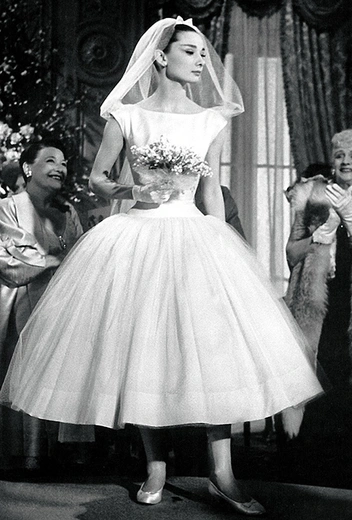 Второму свадебному платью, которое для своей любимицы сшил Живанши, было суждено появиться только в кино. В 1957 году на экраны вышел фильм «Забавная мордашка» (Funny Face), в котором Хепберн сыграла одну из самых известных своих ролей — роль продавщицы из книжного магазина Джо Стоктон. Свадебное платье, в котором Одри отплясывала вместе с Фредом Астером, стало ярким олицетворением свадебной моды 50-х и 60-х годов — пышная юбка, плотно сидящий корсаж, подчеркивающий женский бюст, и обязательный акцент на талии.