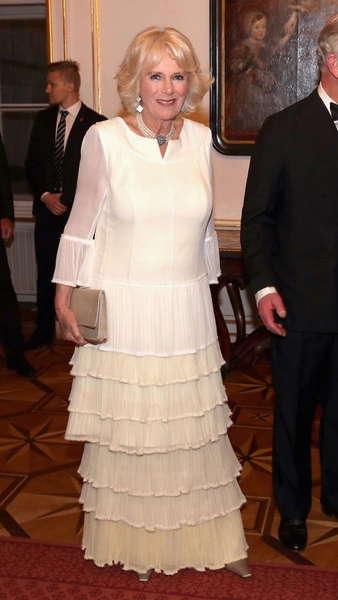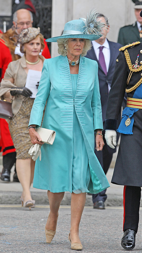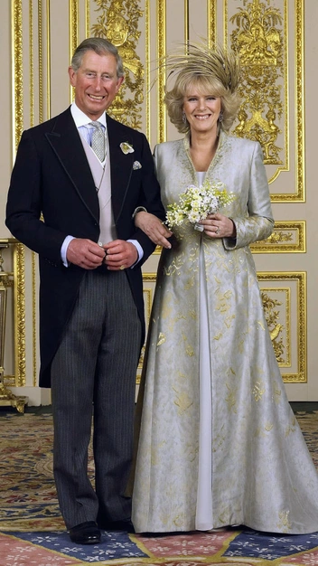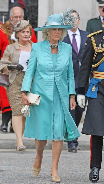 На свадьбе с Чарльзом герцогиня сменила два образа. Для гражданской церемонии она выбрала весьма скромное платье от Robinson Valentine из кремового шифона. Для церемонии в часовне Святого Георгия — уже более торжественный наряд: небесно-голубое платье в пол и расшитое золотыми нитями легкое пальто в тон. Но главным акцентом второго наряда стал необычный головной убор от Philip Treacy. И это несмотря на то, что обычно королевские невесты выходят замуж в тиарах (читайте также: Против правил: почему Камилла отказалась от тиары на свадьбе с Чарльзом).