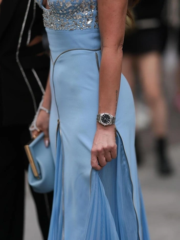 Еще один фаворит среди самых модных девушек в мире — это часы Audemars Piguet ультратонкие с циферблатом в оттенке smoky blue. Полностью титановый корпус, метки из белого золота, индикатор лунных фаз, задняя крышка с сапфировой вставкой, механическая подводка и безупречный стиль не оставят равнодушным ни одного поклонника часовых механизмов. Примерьте аксессуар и убедитесь сами в том, как вы становитесь одновременно роскошной и сильной женщиной с таким властным изделием на тонком запястье.