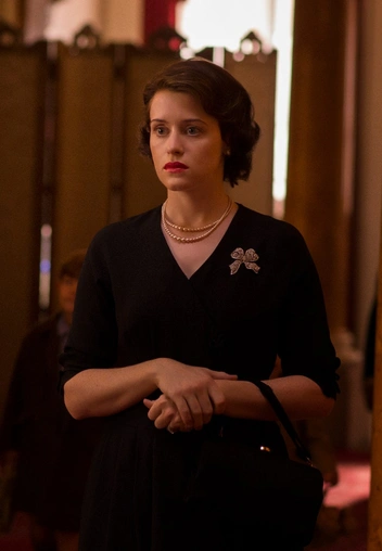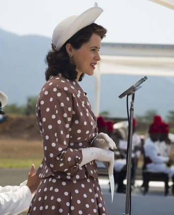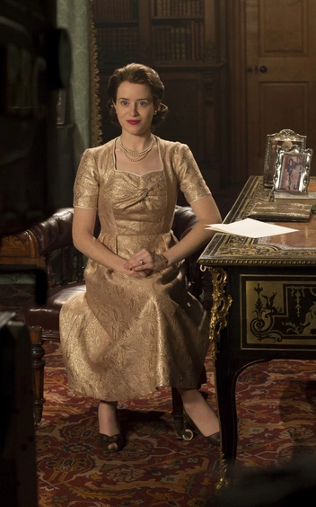 В 1957 году Елизавета II появилась на телевидении, чтобы передать миру свое традиционное рождественское послание. Королева была одета в праздничное золотистое платье миди с деталью в виде узла на лифе. Сияющее платье для Клэр Фой воссоздали практически в деталях.