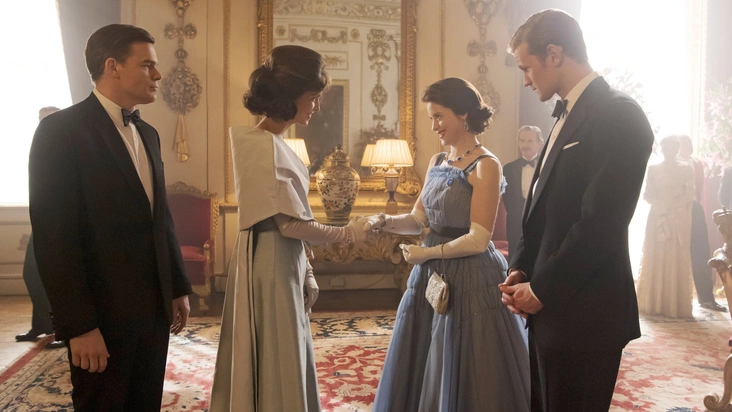 Эта сцена показывала контраст между образами Элизабет и первой леди США Джеки Кеннеди. Наряд Джеки похож на подлинное платье от Dior, которое она носила в реальной жизни, но художники по костюмам добавили шлейф на спине, чтобы в кадре были интересные детали, когда камера снимала позади первой леди. Кроме того, образ Джеки был дополнен накидкой-кейпом в тон. «Нам нужно было делать все в спешке, потому что мы решились на это в тот день, когда все должно было быть готово. Я подбежала к Elstree Studios в обеденное время и успела. Она [накидка] не так хорошо скроена, как платье, но я думаю, нам это почти сошло с рук!» — рассказывала Петри.
