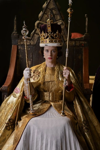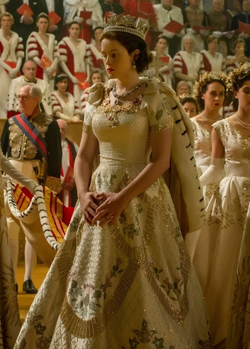 С этим платьем сериалу повезло больше, чем с нарядом для свадьбы принцессы Лилибет — с нуля создавать коронационный наряд не пришлось. По счастливому совпадению в 2012 году компания Swarovski разработала копию наряда для выставки в честь бриллиантового юбилея Королевы, и было решено позаимствовать этот наряд для съемок важной сцены. «Оно было немного длинноватым, но мы надели [на Фой] высокие ботинки, и образ выглядел потрясающе», — говорила Клэптон.