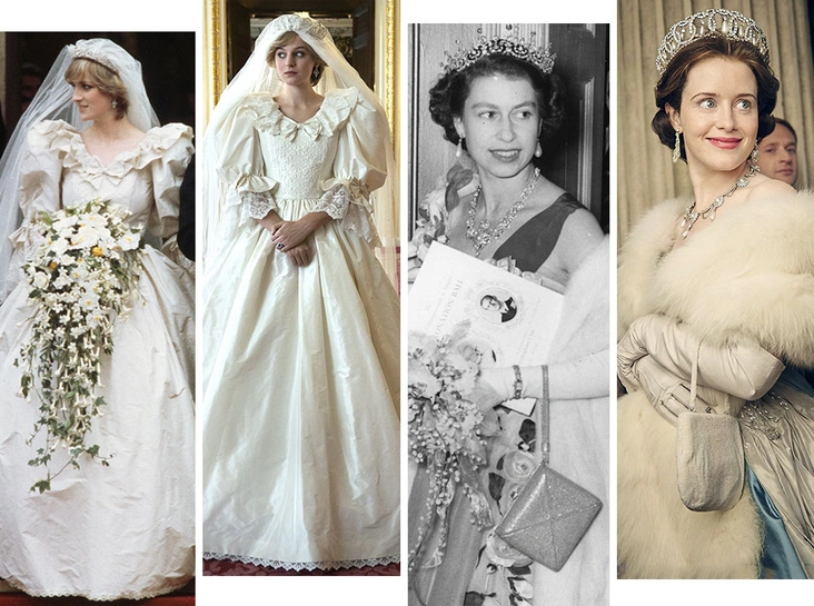 В разное время за дизайн костюмов отвечали Джейн Петри, Мишель Клэптон и Эми Робертс, которые не раз были номинированы на престижную телевизионную премию «Эмми». Художники по костюмам не стремились в деталях скопировать наряды и нередко выбирали вещи, которые могли бы подойти героям в жизни. «Мы не снимаем документальный фильм — это драма», — объясняла Эми Робертс. При этом создатели проекта проводили огромное количество часов в архивах, изучая исследования и просматривая фотографии, книги и фильмы с участием членов королевской семьи и изучая историю их нарядов в деталях. Мы решили сравнить оригиналы самых культовых образов Виндзоров и выяснить, насколько точно художники по костюмам воссоздали самые известные наряды королевских особ.