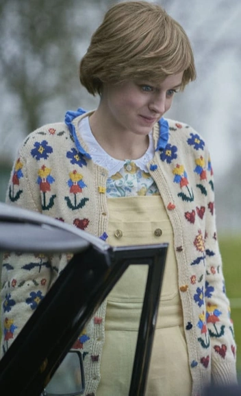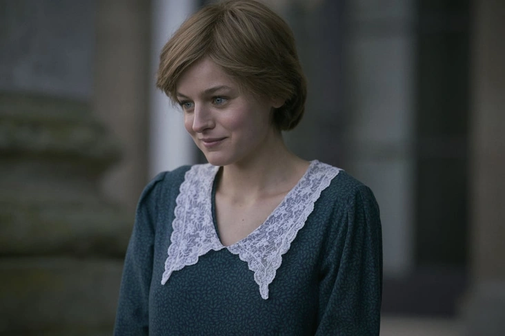 Одна из самых знаменитых фотосессий семьи Уэльских была сделана в 1983 году во время королевского тура в Новую Зеландию. На снимках Чарльз и Диана запечатлены с маленьким принцем Уильямом. Для съемки Диана выбрала трендовое платье в стиле 80-х с пышными рукавами и акцентным воротничком. В похожем образе предстает и Коррин в одной из сцен — правда, в сравнении с подлинным нарядом принцессы образ Эммы выглядит намного более простым и блеклым.
