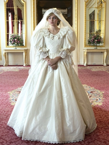 Свадьба Чарльза и Дианы состоялась 29 июля 1981 года, но еще до громкого события будущая принцесса Уэльская постепенно вливалась в королевскую жизнь и посещала мероприятия в роли невесты будущего короля. В июне того же года Диана отправилась на премьеру ленты «Только для твоих глаз», двенадцатого фильма о британском суперагенте Джеймсе Бонде. В кинотеатре юная леди Ди предстала в ярко-красном платье с металлизированной вышивкой. Образ для Эммы Коррин, которая исполняет роль Спенсер в сериале, был воссоздан практически в мельчайших деталях. Однако в кадре экранная Диана носит тиару, что королевским особам разрешается только после свадьбы. Поэтому можно предположить, что художники по костюмам решили одеть героиню в тот же наряд для другого события уже после венчания с Чарльзом.