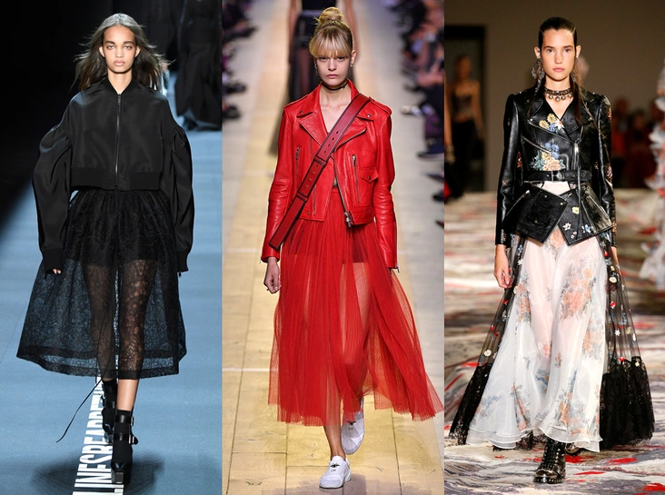 Еще один способ компенсировать откровенность прозрачных вещей, а заодно подчеркнуть их женственность – контраст с вещами из плотных и грубых тканей. Это может быть брючный костюм в мужском стиле, удлиненный жакет, кожаная куртка, бомбер, пончо и все остальное, что сможете придумать, надетое вместе с просвечивающим платьем/блузкой/юбкой (нужное подчеркнуть). Главное – «весомый» материал и достаточно объемный фасон, чтобы увести образ подальше от зыбкой грани с пошлостью. Ко всему прочему такой комплект отлично смотрится в варианте монохромного total-look, потому как существенная разница плотности тканей делает образ очень фактурным.