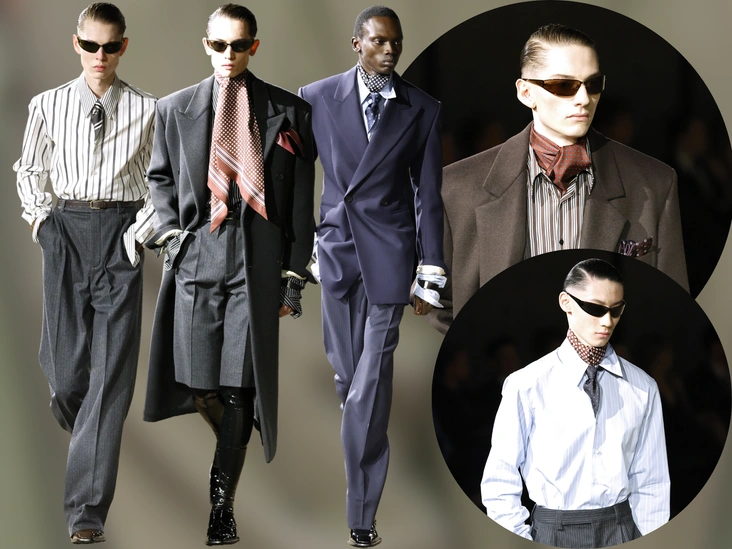 Галстук — вещь горячо любимая для Ваккарелло. Как мы помним еще по нашумевшей коллекции весна-лето 2025, в них он одинаково готов нарядить не только мужчин, но и женщин. А на последнем шоу дизайнер дорабатывает эту идею и предлагает не просто носить аксессуар, но и экспериментировать с ним всеми доступными способами.