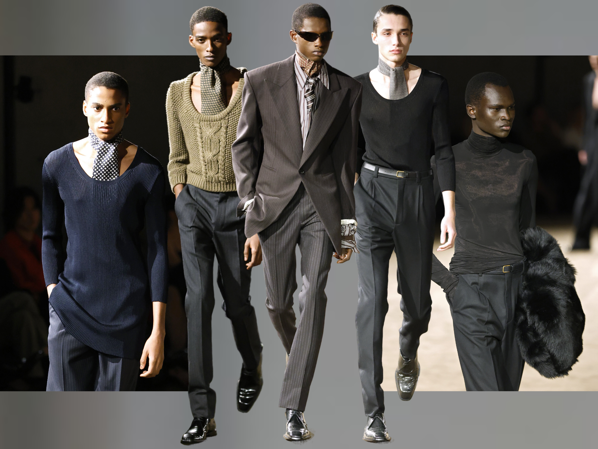 Вдохновлялся дизайнер, по собственному признанию, романом «Комната Джованни», действие которого как раз разворачивается во Франции середины ХХ века. Во время работы над коллекцией он представлял, что помогает экранизировать книгу и разрабатывает костюмы для фильма. Так и родились зауженные жакеты и брюки, лакированные ботфорты и лоферы, а галстуки сменились на изящные платки.