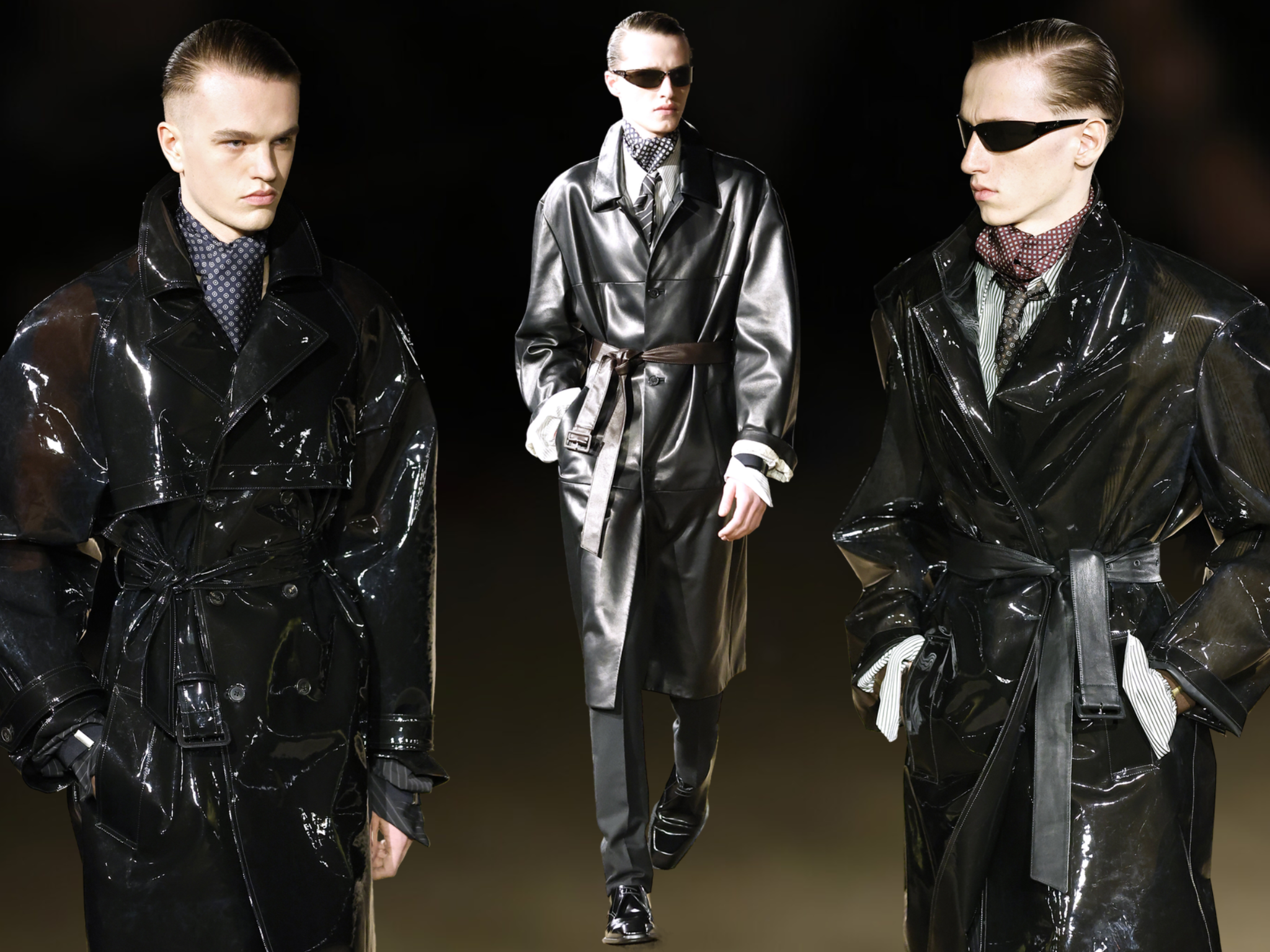 Поэтому для ближайшей весны вооружаемся черными плащами всех мастей — от мягкой кожи до глянцевого винила. Но сочетаем их не с черными водолазками, как завещала художница по костюмам Ким Барретт, а с полосатыми рубашками, классическими брюками и платками. Из оригинальной концепции оставляем только футуристичные очки — на радость всем ценителям, Энтони возвращает их на модную арену.