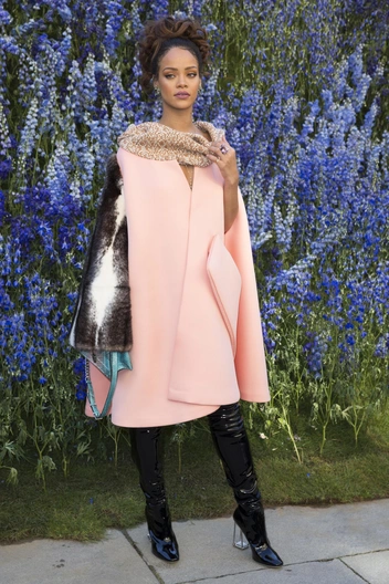Рианна не была бы Рианной, если бы во время выхода на весенне-летнем показе Dior 2016 года в точности скопировала бы подиумный образ. Звезда обожает удивлять, поэтому к объемному кейпу конфетно-розового оттенка добавила не шифоновое платье в пол, а смелые лакированные ботфорты на прозрачных каблуках.