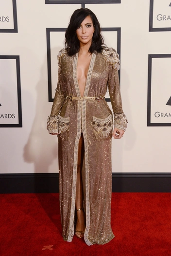 Хотя стилисты советуют выбирать между пикантными вырезами или декольте, чтобы образ не смотрелся «чересчур», Ким Кардашьян — явно не из тех, кто будет выбирать что-то одно. Звезда обожает смелые и пикантные образы, и в кутюрной коллекции Jean Paul Gaultier как раз нашлось платье ей по вкусу. Золотой цвет и богатый сверкающий декор отлично вписались в стиль звезды, однако рукава оказались для Ким чересчур длинными и смотрелись менее удачно, чем на модели.