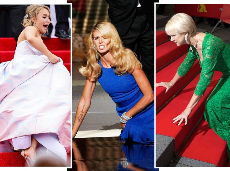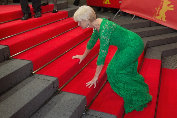 От досадных падений не застрахованы даже те опытные селебрити, за плечами которых — сотни (если не тысячи) выходов на премиях и церемониях. На ковровой дорожке 65-го Берлинского международного кинофестиваля в 2015 году не устояла и Хелен Миррен. На ней было длинное кружевное ярко-зеленое платье, в котором, к сожалению, она запуталась. Однако в исполнении культовой актрисы даже падение на лестнице выглядит грациозно.