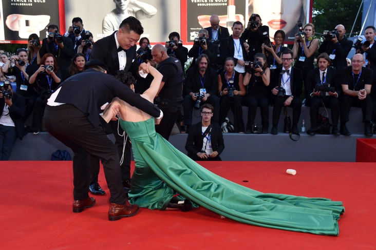 Для китайской актрисы Лян Цзинкэ эффектный выход на Венецианском кинофестивале в 2016 году оказался более драматичным, чем она планировала. На премьере фильма «Свет в океане» ее безупречное платье нефритового оттенка было слишком длинным и узким — и, к сожалению, с ним актриса совладать не смогла.