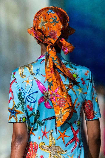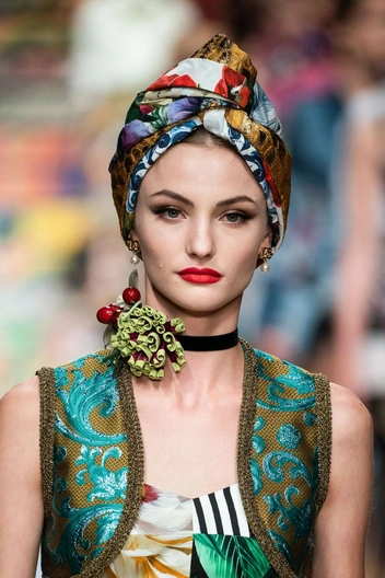 Тренд который продолжает держать свои позиции и остается быть актуальным в 2021 году. Носить их можно как угодно, дизайнеры демонстрируют нам легкие и доступные каждому варианты. Косынку можно повязать на низкий хвост сзади как резинку или завязывая под подбородком как делали наши бабушки. А для более смелых предлагаю завязать платок в качестве банданы или широкой полосы и выпустить пару прядей у лица. Более сложный вариант показали нам Dolce & Gabbana повязав платок на африканский манер.