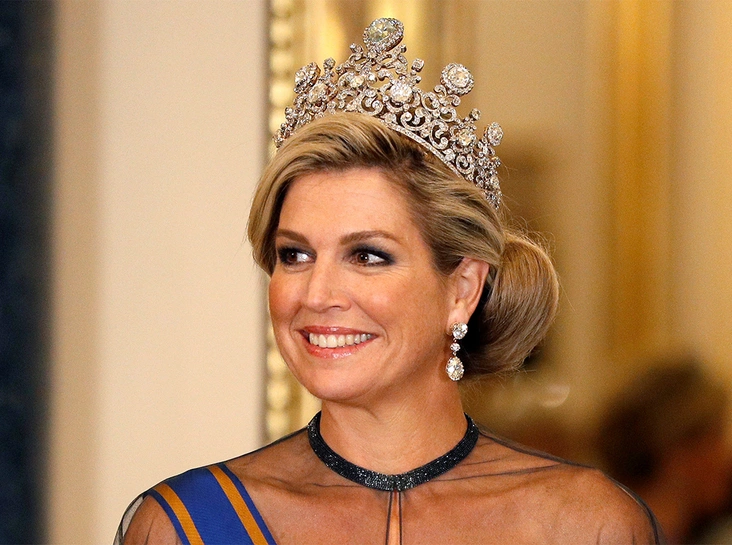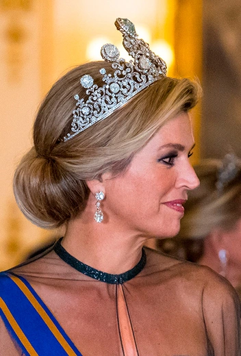 Без преувеличения, это самая выдающаяся тиара вечера. Название «Стюарт» украшение получило по центральному камню – огромному бриллианту в 39,75 карат редкого оттенка цвета морской волны. Бриллиант был куплен регентами Англии – королем Вильгельмом III, принцем Оранским, и королевой Марией II Стюарт в конце 17-го века. Поскольку пара была бездетной, после смерти обоих бриллиант отошел в собственность дома Оранских и так попал в Нидерланды (в 1702 году). Несмотря на предпринимаемые британскими монархами попытки вернуть драгоценность в свою казну, «Стюарт» в итоге обрел свой дом и свое место в тиаре королевы Вильгемины, предположительно в 1897 году, став центральным камнем тиары «Стюарт». Сама тиара – часть парюры, в которую входят еще серьги и массивнейшая брошь, настолько большая, что дамы королевского дома Нидердандов предпочитают носить ее на корсете (что Максима и сделала в этот вечер).
