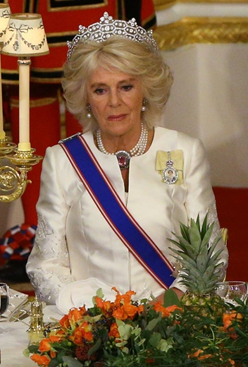 Герцогиня Корнуольская тоже решила надеть самое любимое – тиару, некогда принадлежавшую леди Маргарет Гревилл. Имя этой дамы всплывало совсем недавно – в день свадьбы принцессы Евгении, голову которой украсила гревилльская изумрудная тиара «кокошник» (читайте: Настоящая принцесса: свадебный образ Евгении Йоркской). Будучи бездетной вдовой и подругой королевы и королевы-матери, леди Маргарет завещала все свои невероятные богатства королевской семье. Так «Соты» попали в собственность матери Елизаветы II, а затем перешли к ней, а уже после была отдана в пользование второй жене принца Чарльза. Но у Камиллы есть своя история, связанная с леди Гревилл. Дело в том, что та была крестной матерью бабушки Камиллы (и близкой подругой прабабушки, любовницы Короля). Так что, не удивительно, что Камилла почитает гревилльскую тиару более других, хотя имеет огромный выбор, благодаря своему положению.
